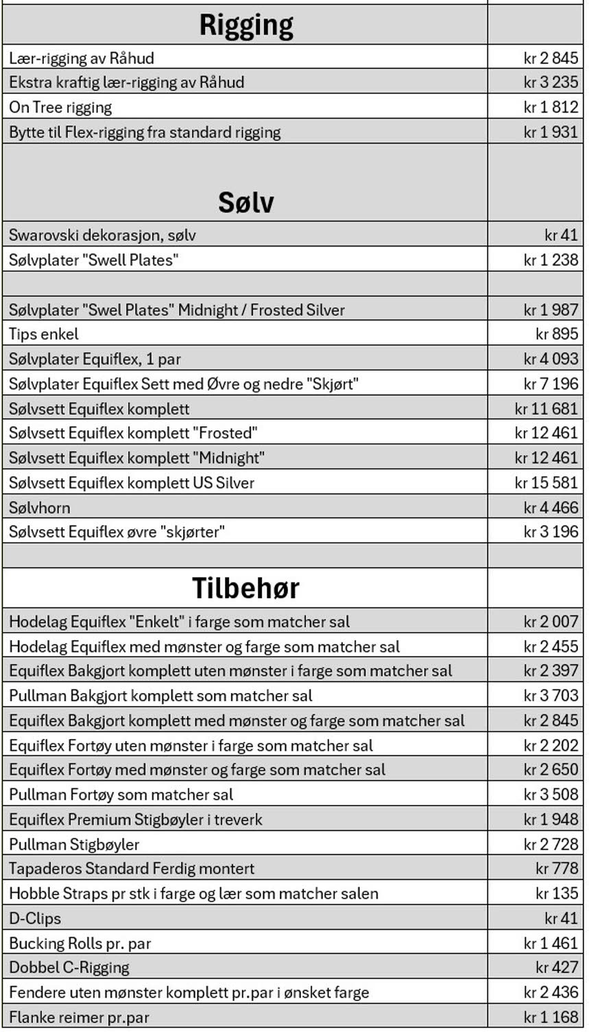 Vi har tatt hensyn til dette og lager derfor saler etter våre kunders ønsker og ideer, slik at de får akkurat den salen de ønsker. Vår Custom-made service innbefatter våre Equiflex saler og våre Pullman saler. Dette betyr at vi etter ønske kan levere saler med forskjellige bommer, design, utskjæringer / mønster samt forskjellig setelær osv.