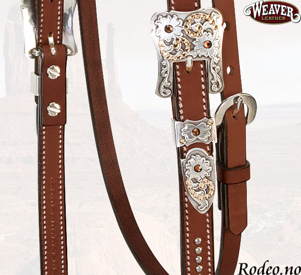 Dette hodelaget er laget i beste 3/4" (1,9 cm) lær. Dobbeltsydd med "nagler" og Sterling Silver conchos og spenner med Swarovski krystaller. Hodelaget har en smidig dobbeltsydd pannereim. Spenner og Conchos er belagt med en beskyttende overflate behandling.